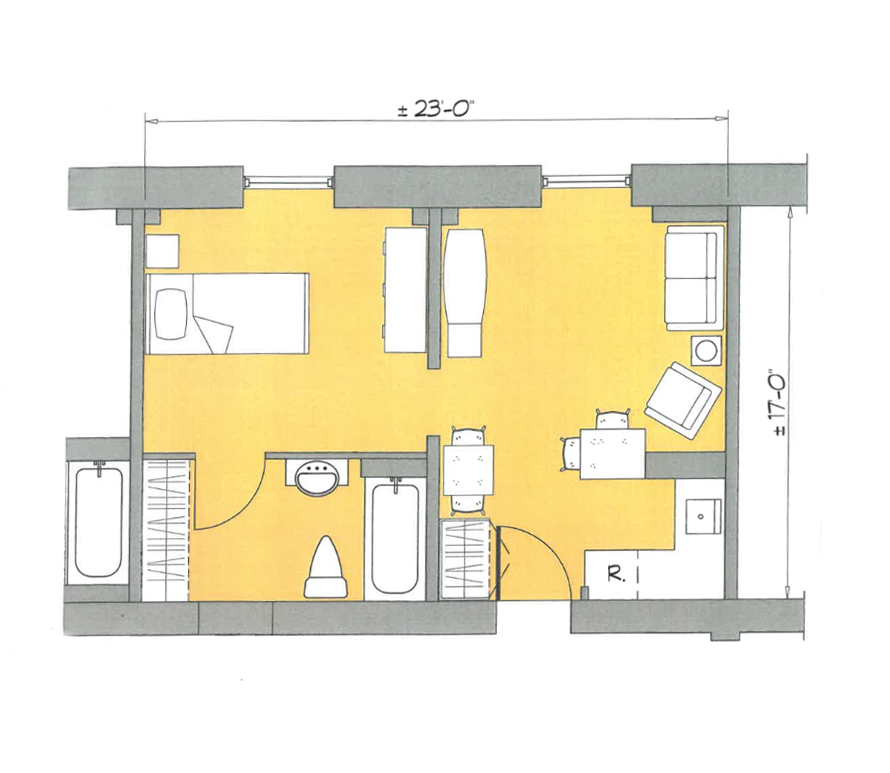 Les studios permettent un espace de vie confortable. En choisissant cette option, vous optez pour le forfait trois repas offerts au Monastère. Parfait pour ceux qui n’aiment pas cuisiner, qui adorent socialiser et tisser des liens avec les autres. Les repas sont servis en salle à manger. Les studios offrent une salle de bain complète, un coin cuisinette, un espace salon et une chambre à coucher. Nous vous offrons également la paix d’esprit en incluant plusieurs services dans le prix de votre loyer : électricité, chauffage, téléphonie, câble, internet, entretien ménager et literie.